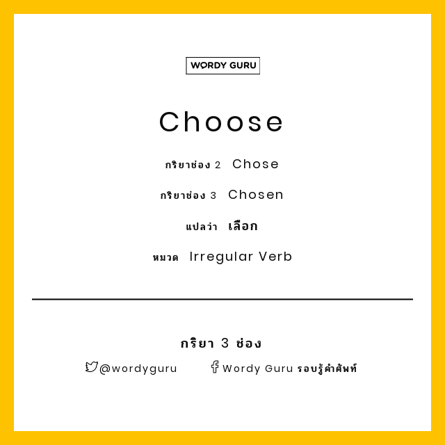 Choose Verb 2. Conjugations of the english verb choose can be found below. Verbs in a regular structure can be transformed with a simple rule, whereas in irregular verbs, this irregular verbs are used in the form of verb 2 and verb 3, past participle, depending on the situation.