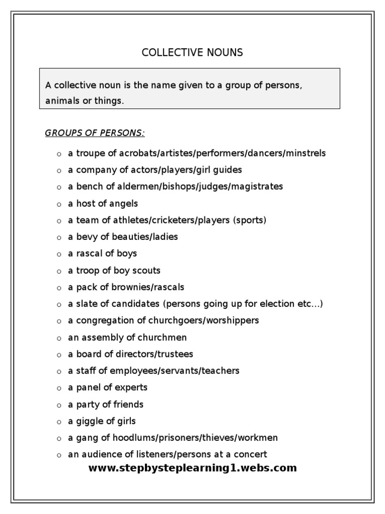Make collective nouns a simple concept and ease your confusion with these collective noun examples. We can use collective noun to identify group of nouns to make using collective nouns we can group more than one things, place, person, animal, idea, etc. Grammar of the english language in a series of letters: This article helps you learn detailed list of collective nouns with pdf lesson.