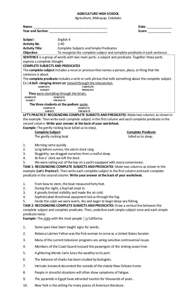 The subject of a complete sentence is who or what the sentence is about, and the predicate tells about that subject. Subjects how can i tell the difference between a subject and a predicate? Some of the worksheets for this concept are complete subjects and predicates, simple subjects and predicates, subjects predicates, work 5 finding subjects and predicates, simple subjects simple predicates. It tells how the action is being done, where the action is being done, and in the following sentence, the complete subject is italicized and the simple subject is capitalized: