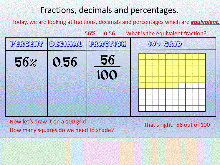 In this section we revisit the equivalence of fractions, decimals and percentages; Fraction = percent = decimals equivalents. Percents, fractions, and decimals are all just different ways of writing numbers. Decimals, fractions, and percentages are just different ways of showing the same value.