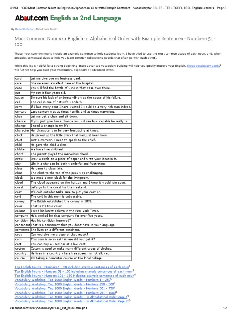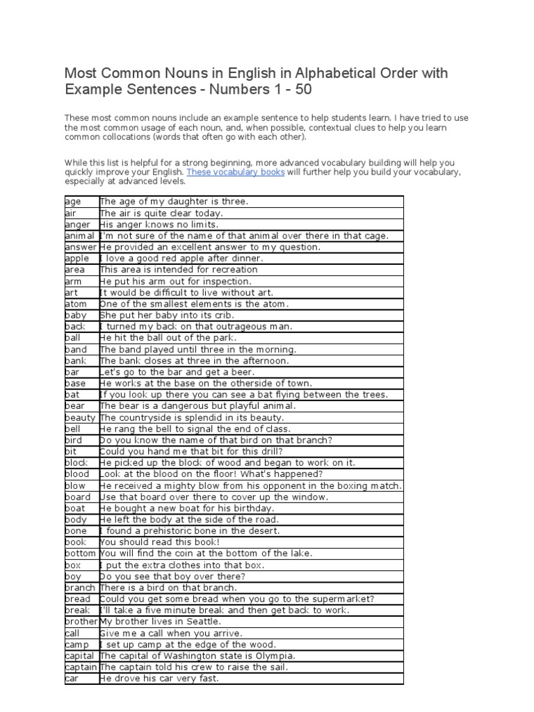List Of Common Nouns In Alphabetical Order. This is a select list of 250 common uncountable nouns presented in alphabetical order. Alphabetical order is a system whereby character strings are placed in order based on the position of the characters in the conventional ordering of an alphabet.