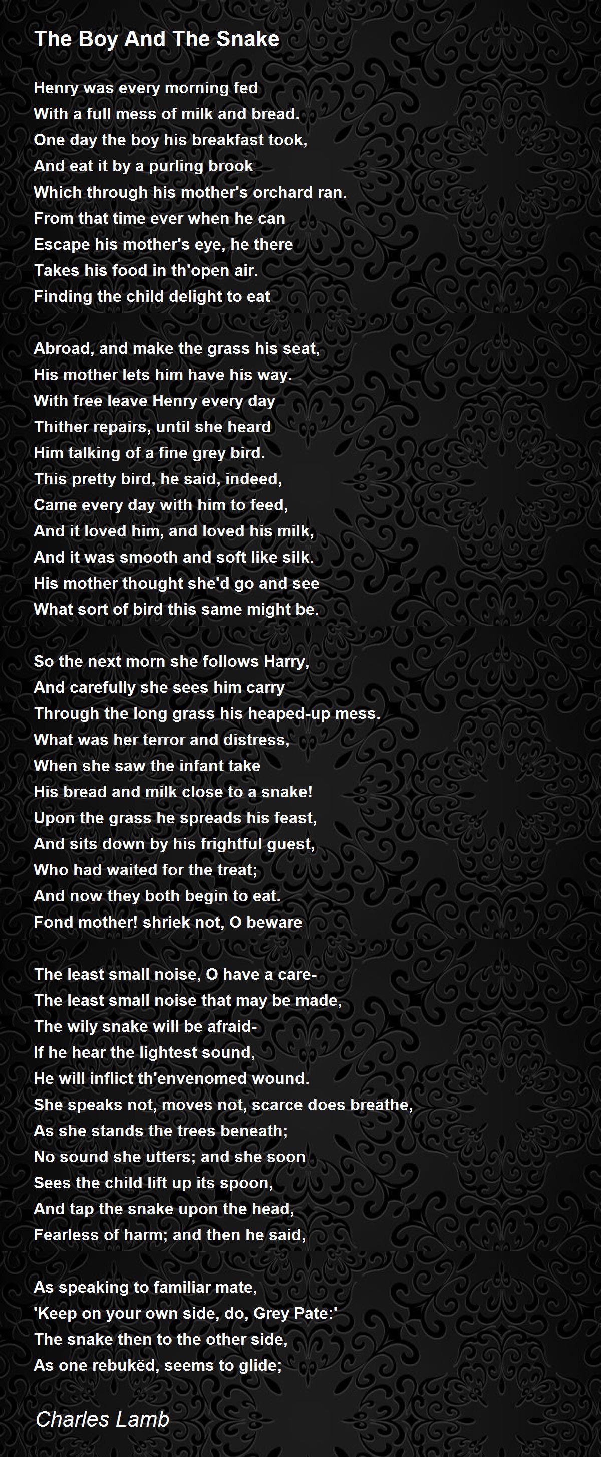 The Snake Poem. After the woman lets the snake in and revives it with honey and some milk, the. Most beautiful snake poems ever written.